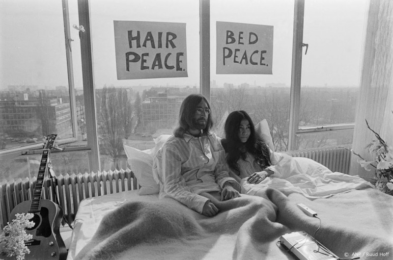 3FM demonstreert vanuit bed van John Lennon en Yoko Ono in Hilton