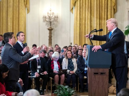 De CNN-verslaggever kwam tijdens een persconferentie over de uitslag van de tussentijdse verkiezingen in aanvaring met Trump, toen hij vragen stelde over Trumps opmerkingen over immigranten tijdens de verkiezingscampagne. Een medewerkster van het Witte Huis probeerde de journalist de microfoon af te pakken. Dat voorkwam Acosta door haar hand weg te duwen.